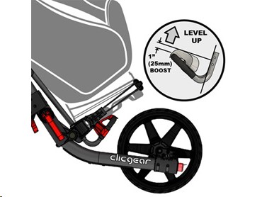 The Clicgear Booster Clip can help boost up stand bags or tour bags that need more clearance above the front wheel. The clip can also be used with the Tour Bag Kit as an easier way to adjust the bag position away from the front wheel.