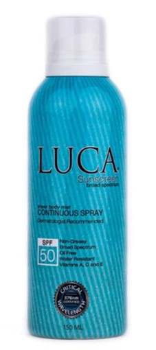The Luca Continuous Spray Sheer Body Mist Sunscreen is an oil/PABA free formula that sprays on from any direction helping you protect your entire body from harmful UVA/UVB rays. This sunscreen spray has SPF 50 protection, is non-greasy and is water resistant. This sunscreen is infused with Vitamins A, C & E. Features: -SPF 50 -Non-greasy -Water resistant -Infused with Vitamins A, C, & E -Hypoallergenic and will not clog your pores