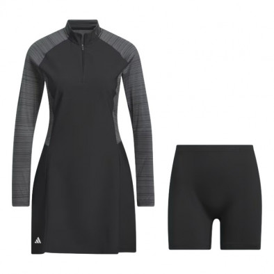The adidas Ultimate365 Long Sleeve Ladies Dress is designed with a half zip with a stand-up collar, concealed side zip pocket and one back pocket. The dress features plenty of stretch that maintains an unrestricted feel for a natural range of motion. Features: -Regualr fit -Half zip with stand-up collar -Concealed side zip pocket -One back pocket -Solid and stripe fabric blocking -Separate undershorts with side pocket