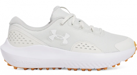 The Under Armour Surge Ladies White Golf Shoes are designed with a water-resistant textile upper, a durable rubber outsole with directional traction pattern and a lace up style for the perfect fit. The shoes feature a deluxe comfort system sockliner that moulds to your foot for the ultimate comfort and a charged cushioning midsole that provides all day comfort and responsiveness and durability all day long. Features: -Water-resistant upper -NeverWet treatment -Enhanced cushioning -Deluxe comfort system sockliner -Charged cushioning -Durable rubber outsole