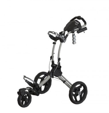 The Rovic RV1 S three-wheeled cart by Clicgear features a swivel front wheel for increased maneuvering in a lightweight, streamlined frame that's easy to push on any golf course. Features: - Front wheel swivels to increase maneuverability - Lightweight, durable construction - Foot-break system and full console
